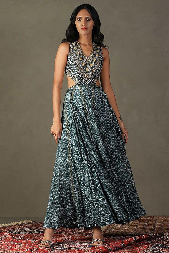 features a mesmerizing Blue Maxi Dress that captivates with its elegance. The eye-catching sleeveless dress is crafted in silk with a V-neckline, geometric print, beads and sequins hand embroidery. Accentuate this designer dress with dangler earrings and heels for a complete look.