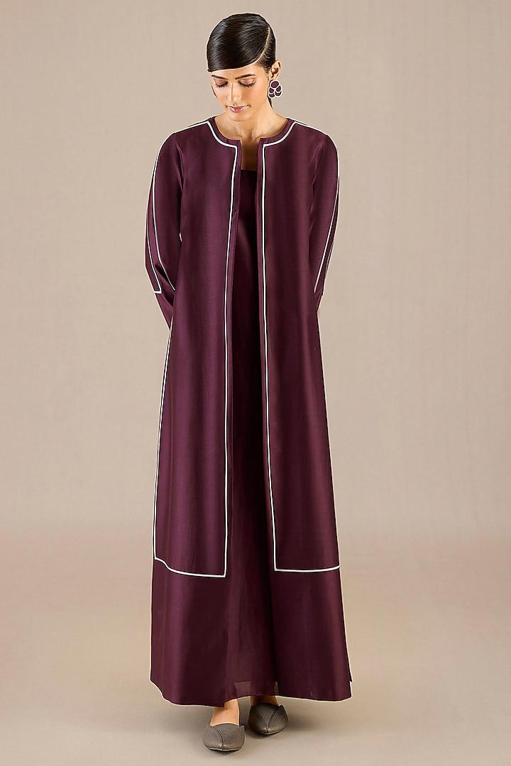 Featuring a burgundy jacket in chanderi base with corded embroidery. It is paired with a cotton silk dress. Style it with statement accessories and sandals for a complete look.