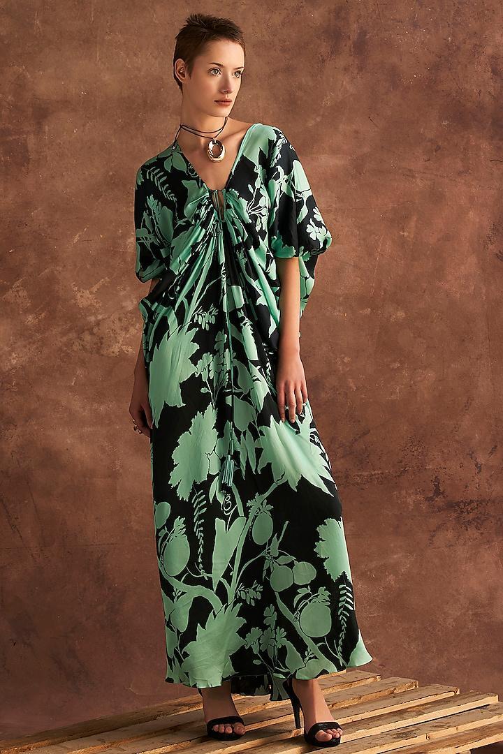 features a mesmerizing Mint Green Kaftan that captivates with its elegance. The eye-catching piece is crafted in bemberg satin with floral print. Accentuate with statement jewellery and heels for a complete look.