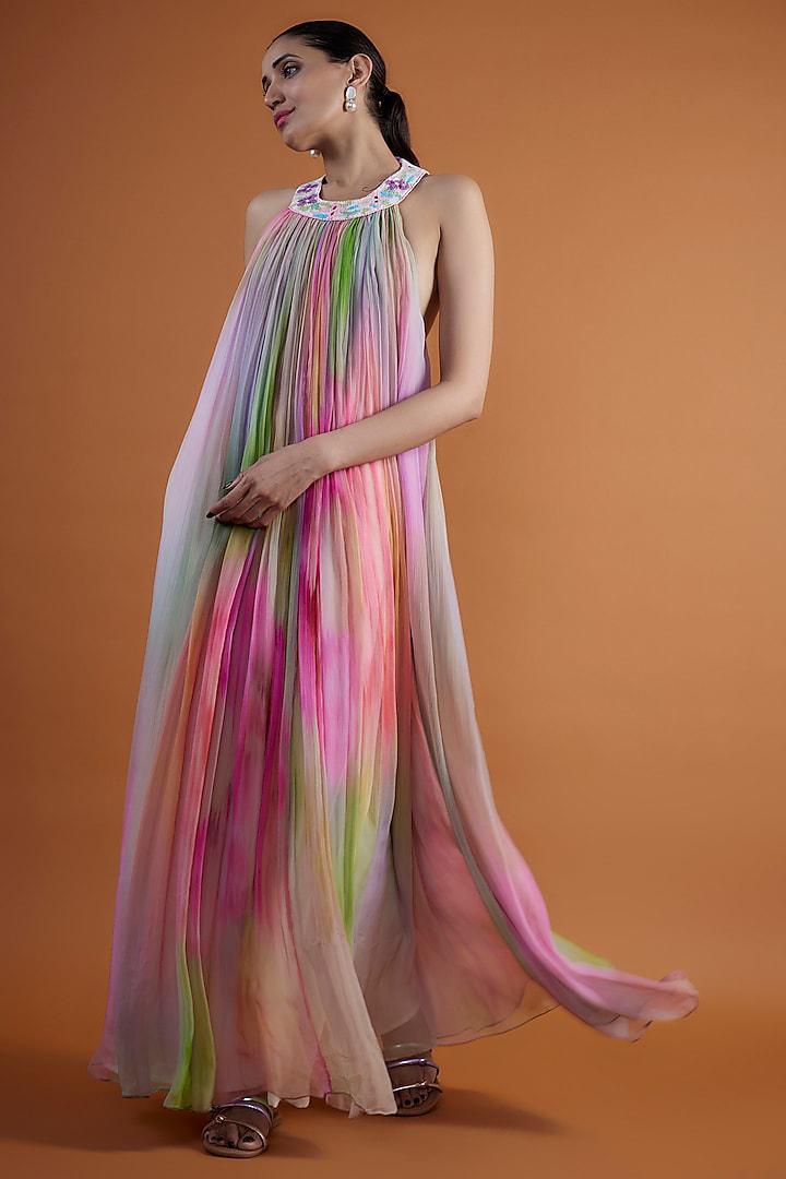 Featuring a pink gathered floral maxi dress in chiffon base with beaded hand embroidery and digital print. Accentuate it with statement earrings and heels for a complete look.