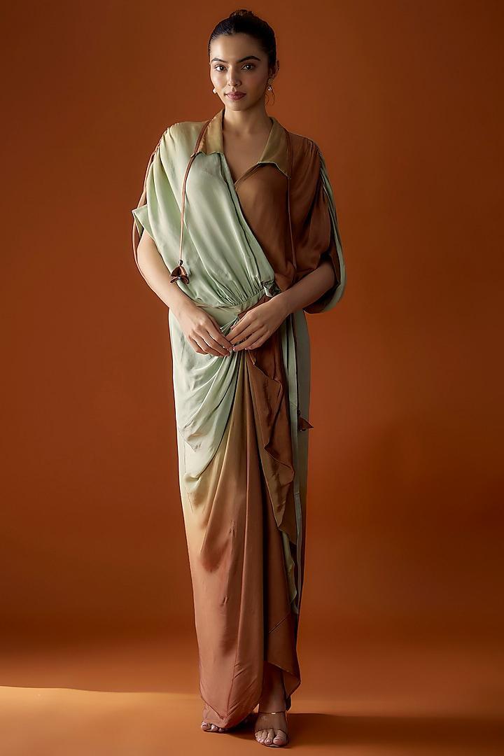 Featuring a pistachio and coffee draped maxi dress in satin base. Style it with dangler earrings and heels for a complete look.