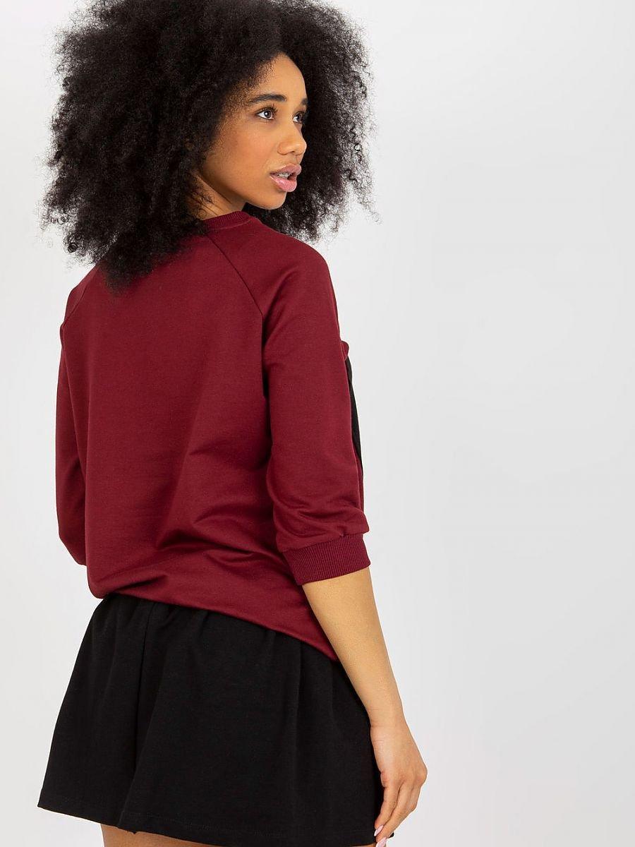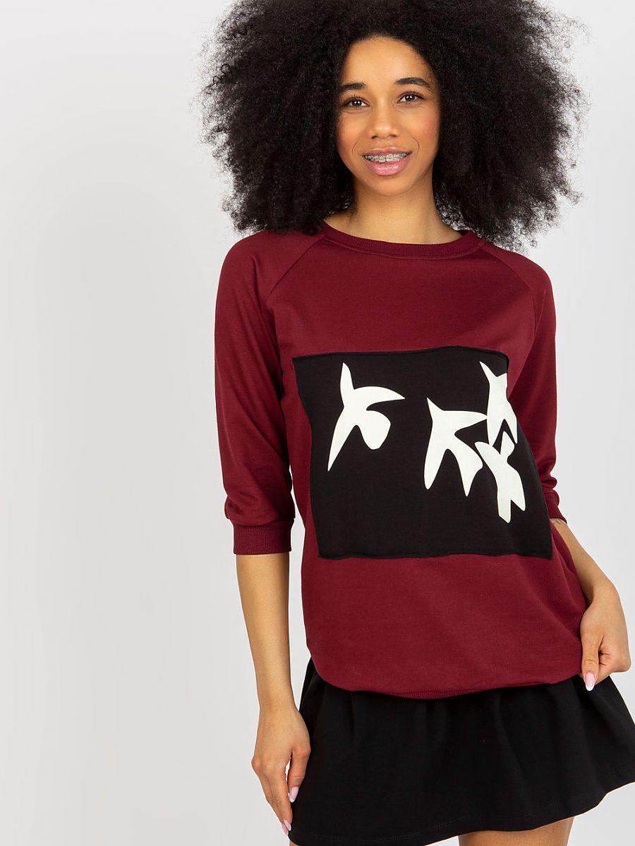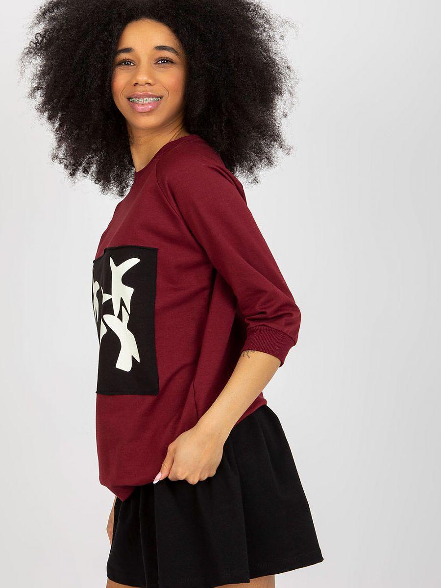 A sweatshirt set consisting of a sweatshirt and a skirt. Blouse with 3/4 sleeves and round neckline. Decorative print on the front. Skirt with higher waist, zipper and button closure.