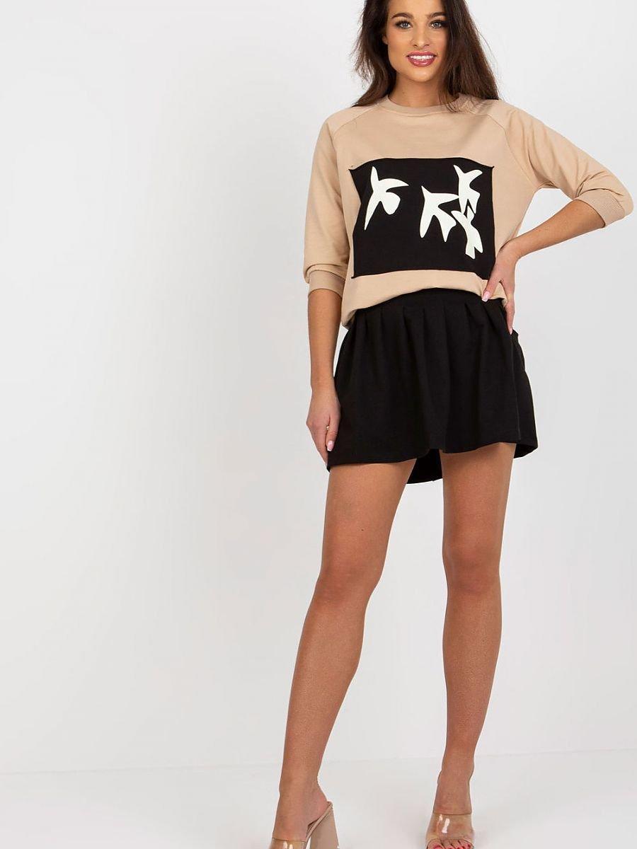 A sweatshirt set consisting of a sweatshirt and a skirt. Blouse with 3/4 sleeves and round neckline. Decorative print on the front. Skirt with higher waist, zipper and button closure.