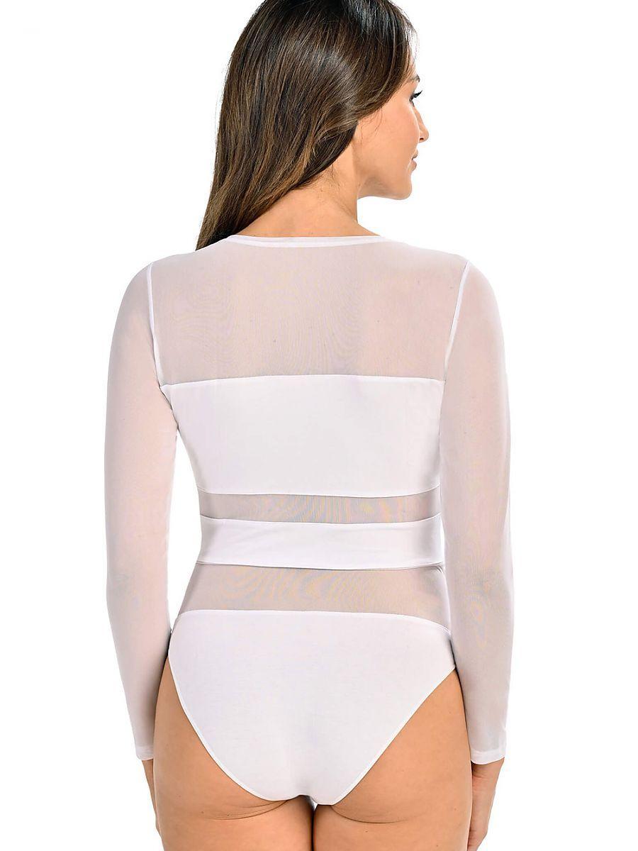 The bodysuit is made of soft and comfortable viscose material combined with transparent mesh on the chest and waist. The underwear is also made of viscose, thick and opaque. The crotch is made easy to close with two or three hooks, depending on the size. The sleeves are made of mesh for a comfortable fit and are finished with a semicircular hem around the neck. This finish allows the corset and silhouette to be seen. The bodysuit has a pronounced cut at the waist that effectively shapes the silhouette, making it attractive and sexy. The mesh bodysuit can be worn with a jacket for a daily commute or for an evening out or dinner with friends. It is an essential part of every woman's closet. Another advantage is that the bodysuit goes well with other outfits, especially with pencil pants, jeans and skirts.