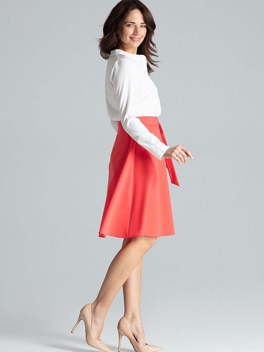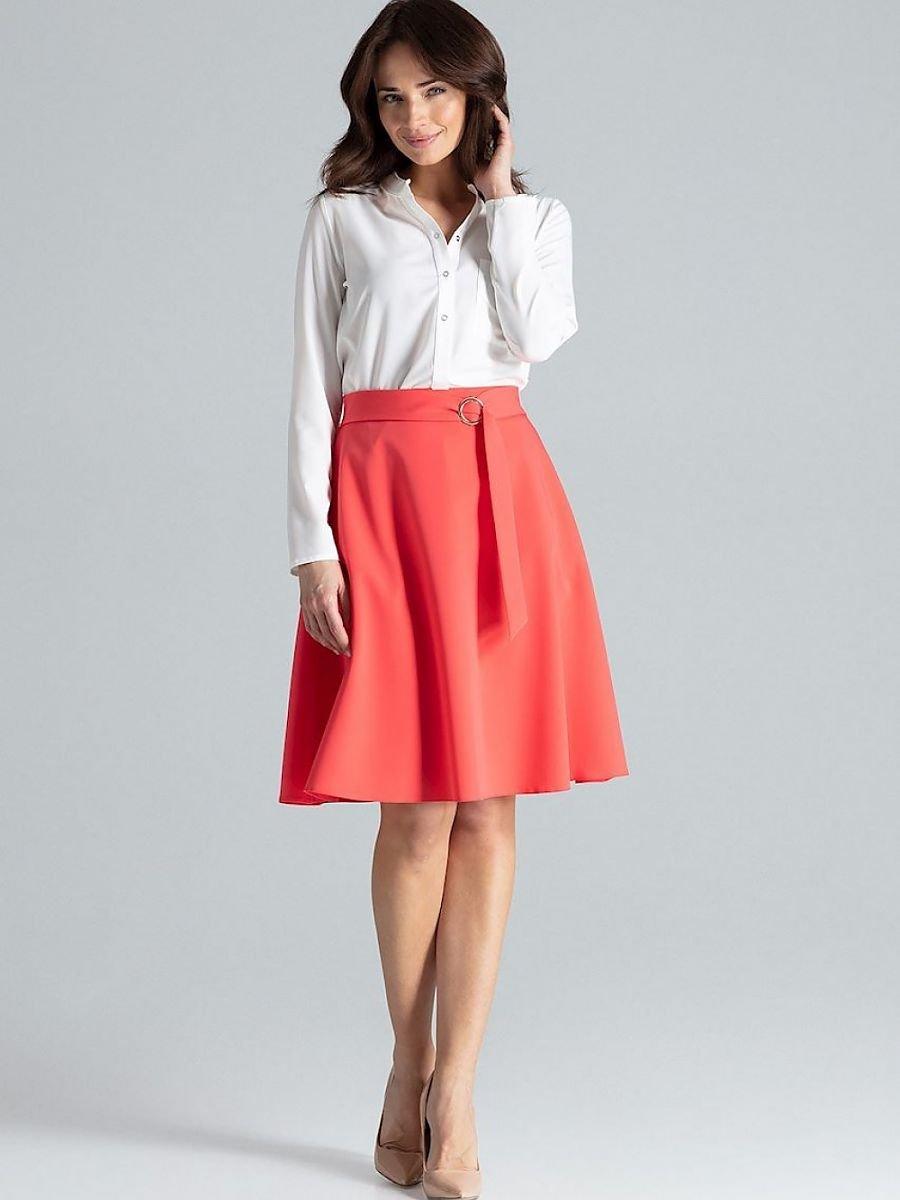 Loose-fitting, knee-length skirt with side pockets. Fastened at the back with a covered zip. A belt with a decorative buckle at the front. Skirt without a lining.