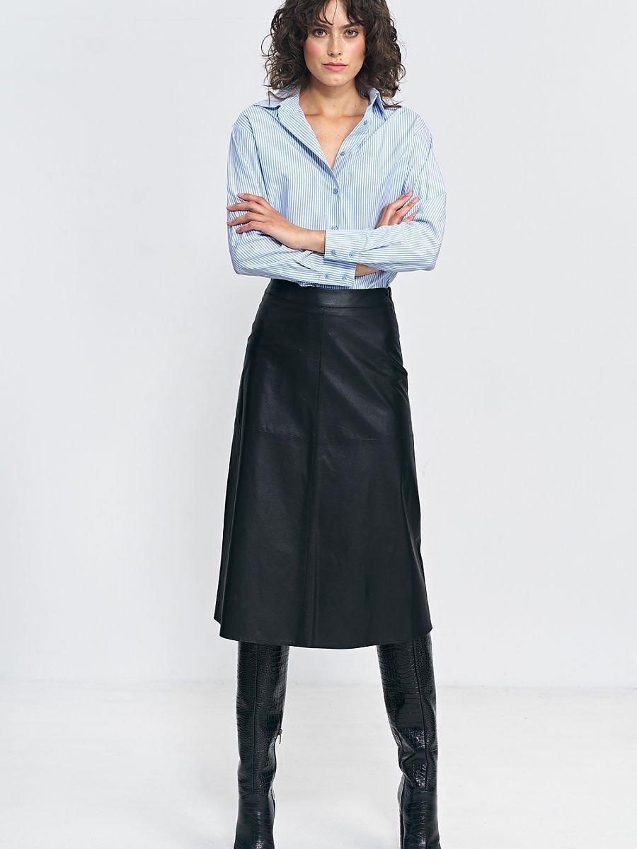 We haven't seen such a skirt with us yet! Trapeze skirt made of imitation leather material will perfectly slim your waist and elongate your silhouette. Fastened on the side with a zipper. This model and the material from which it is made will fit into autumn styling with boots, high boots and thick sweaters.