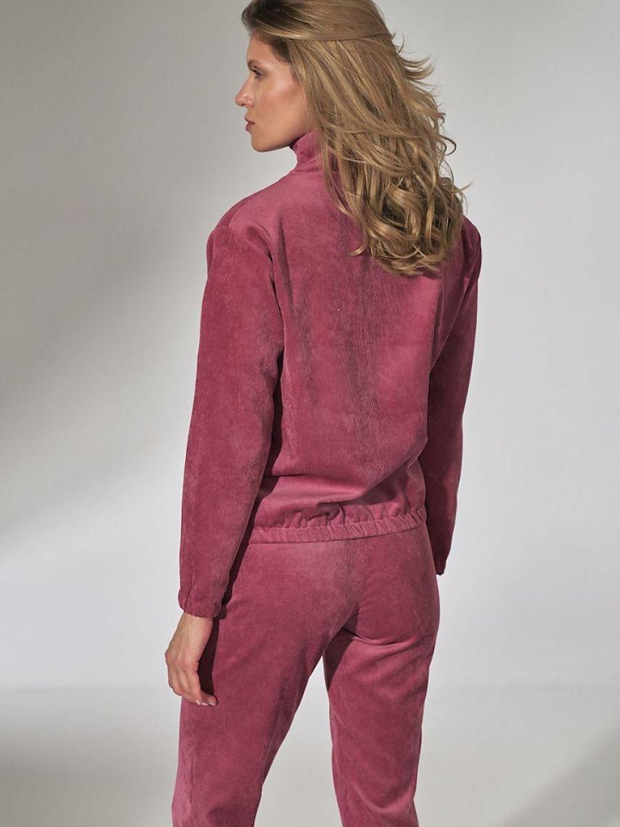 Pink corduroy collar blouse with decorative zipper. Long sleeve and bottom of blouse finished with elastic band.