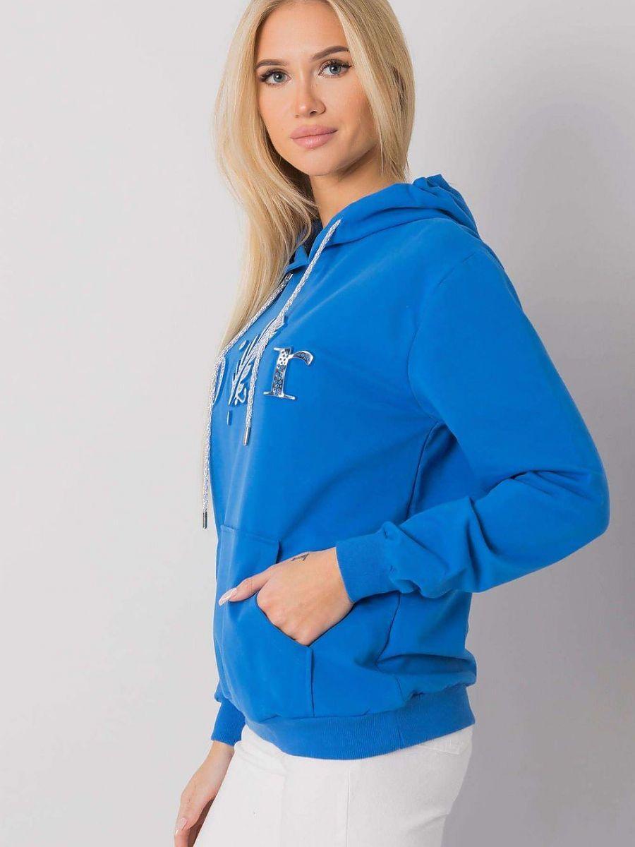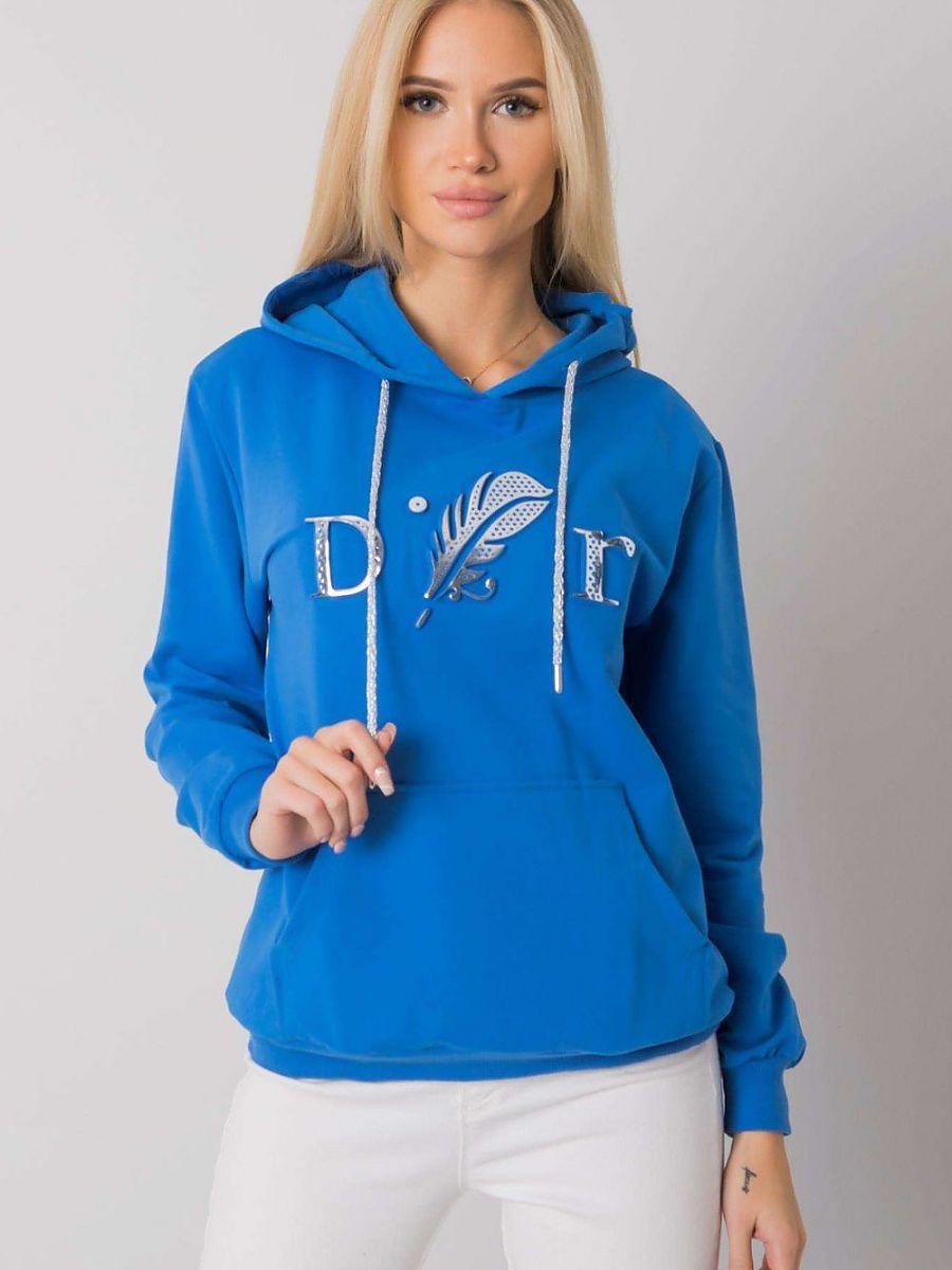 Dark blue ladies' long sleeve kangaroo sweatshirt with a hood.