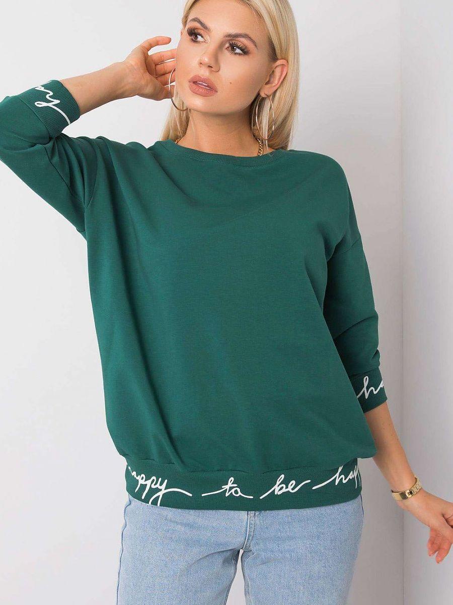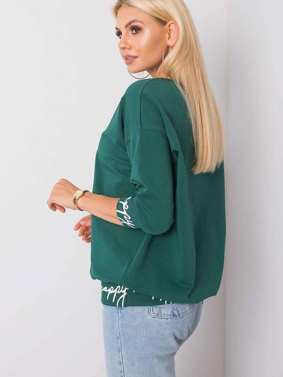 Dark green sweatshirt with words on the cuffs. Sweatshirt with 3/4 sleeves.