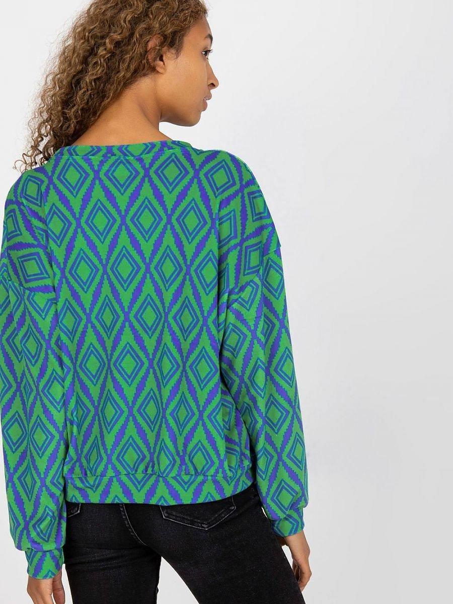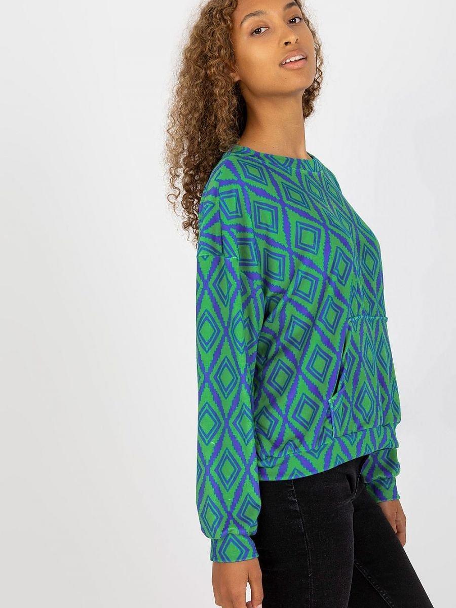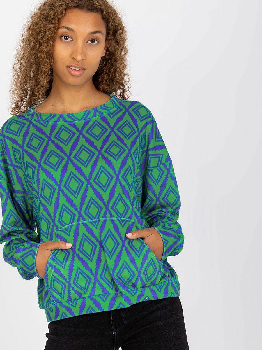 Women's sweatshirt with long sleeves, a kangaroo pocket on the front. The sweatshirt is made of fabric with an interesting pattern.