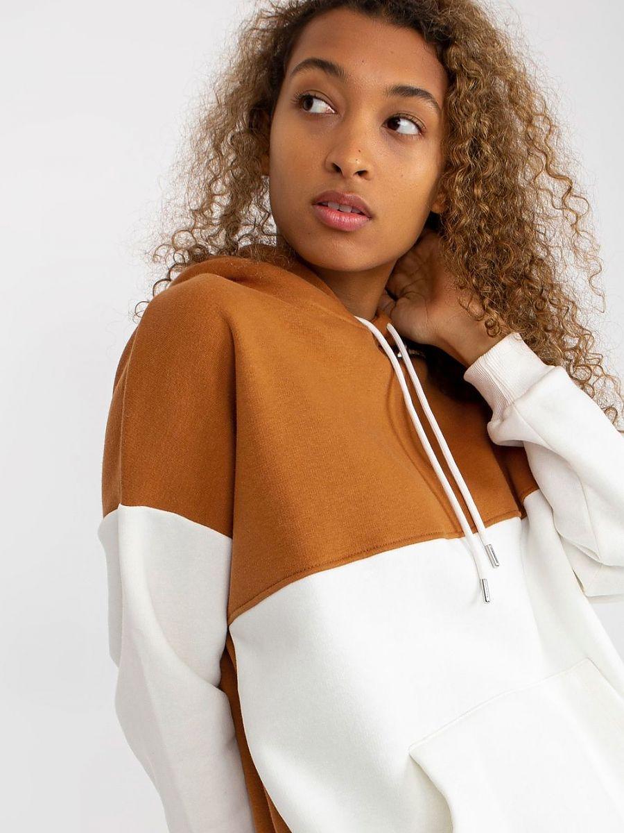 Two-color women's sweatshirt with long sleeves and a hood. On the front there is a kangaroo type pocket.