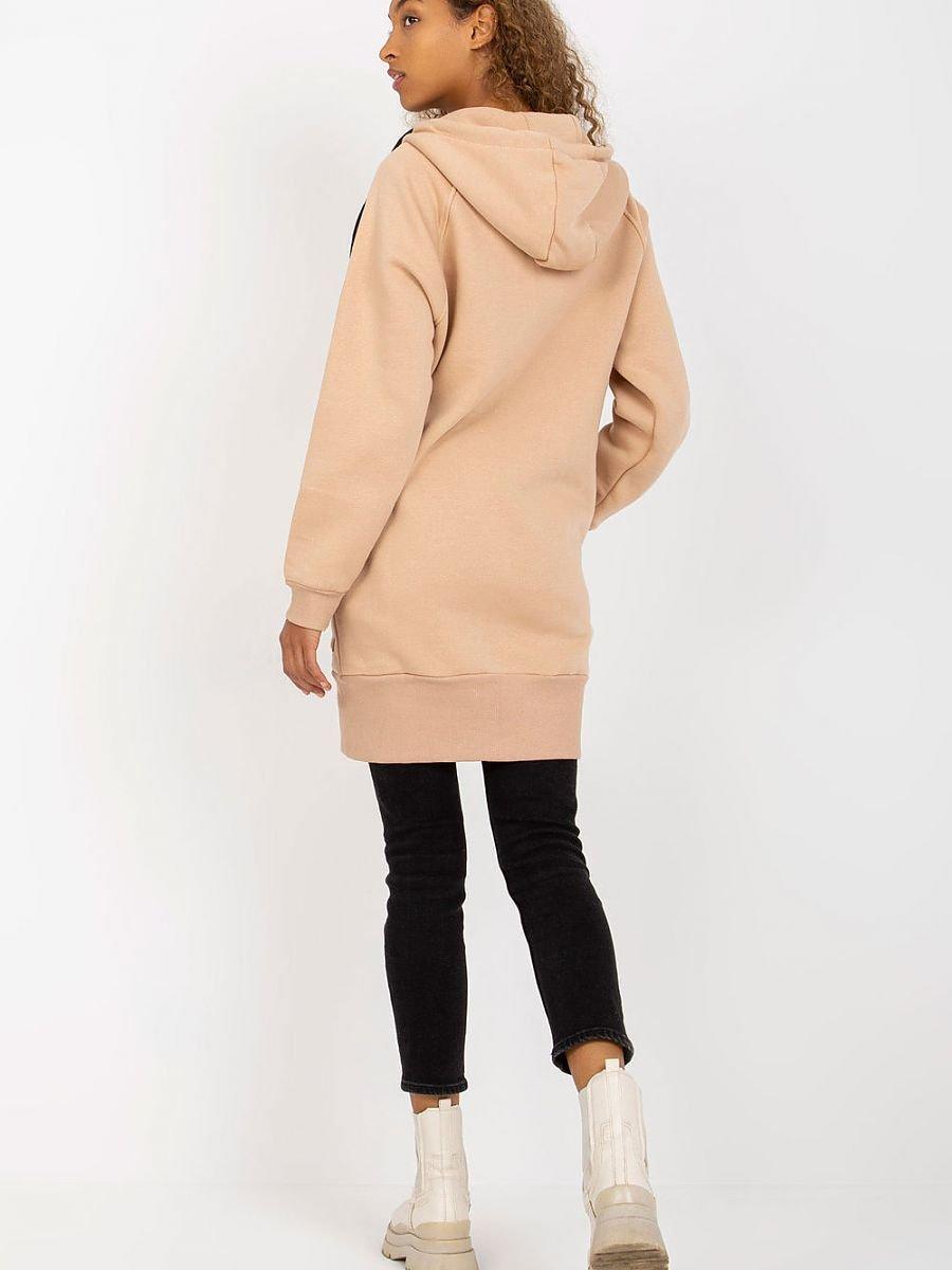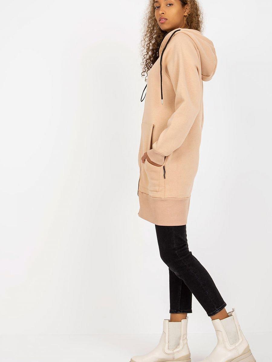 Women's sweatshirt with an extended cut, with long sleeves. Sweatshirt with hood, zippered. Slip-in pockets on the sides.