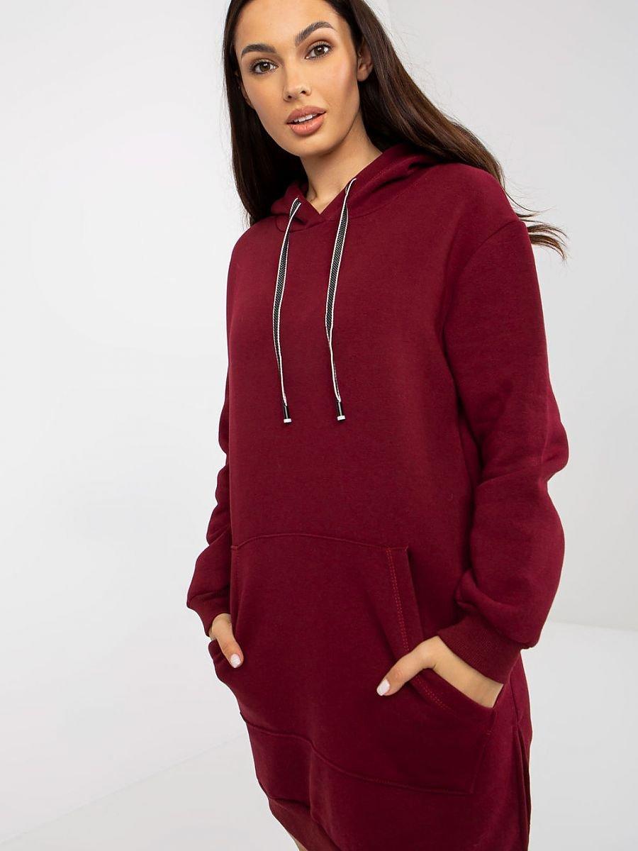 Sweatshirt of an extended cut with long sleeves and a hood. On the front there is a kangaroo type pocket.
