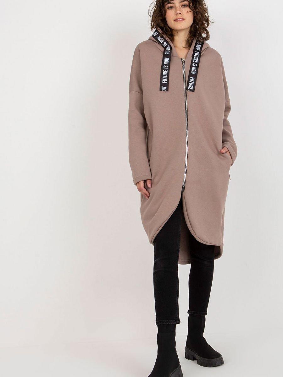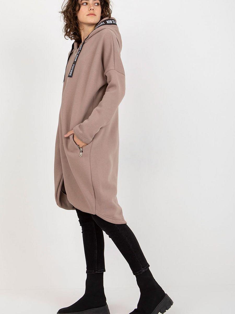 Women's sweatshirt with an extended cut, long sleeves and a hood. The sweatshirt is zippered, with slip pockets on the sides also zippered.