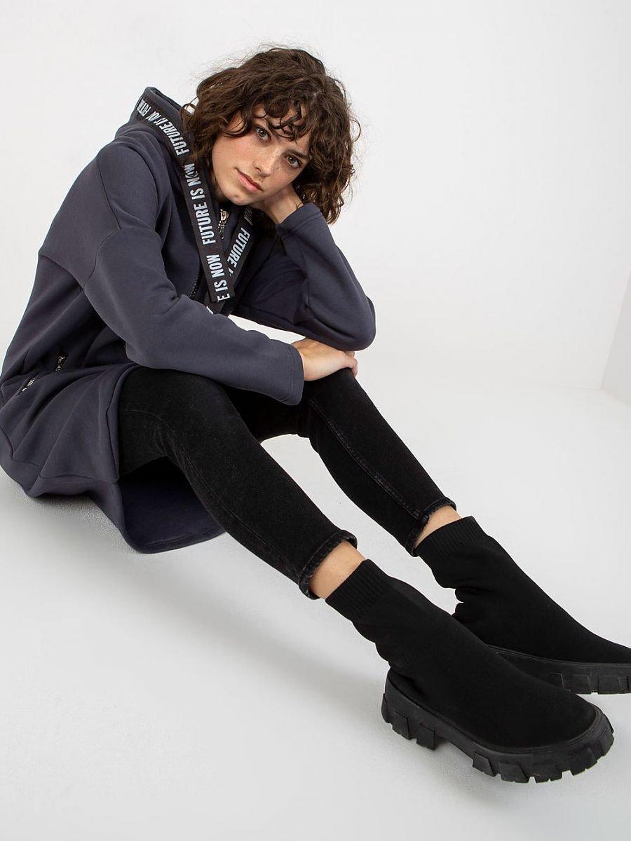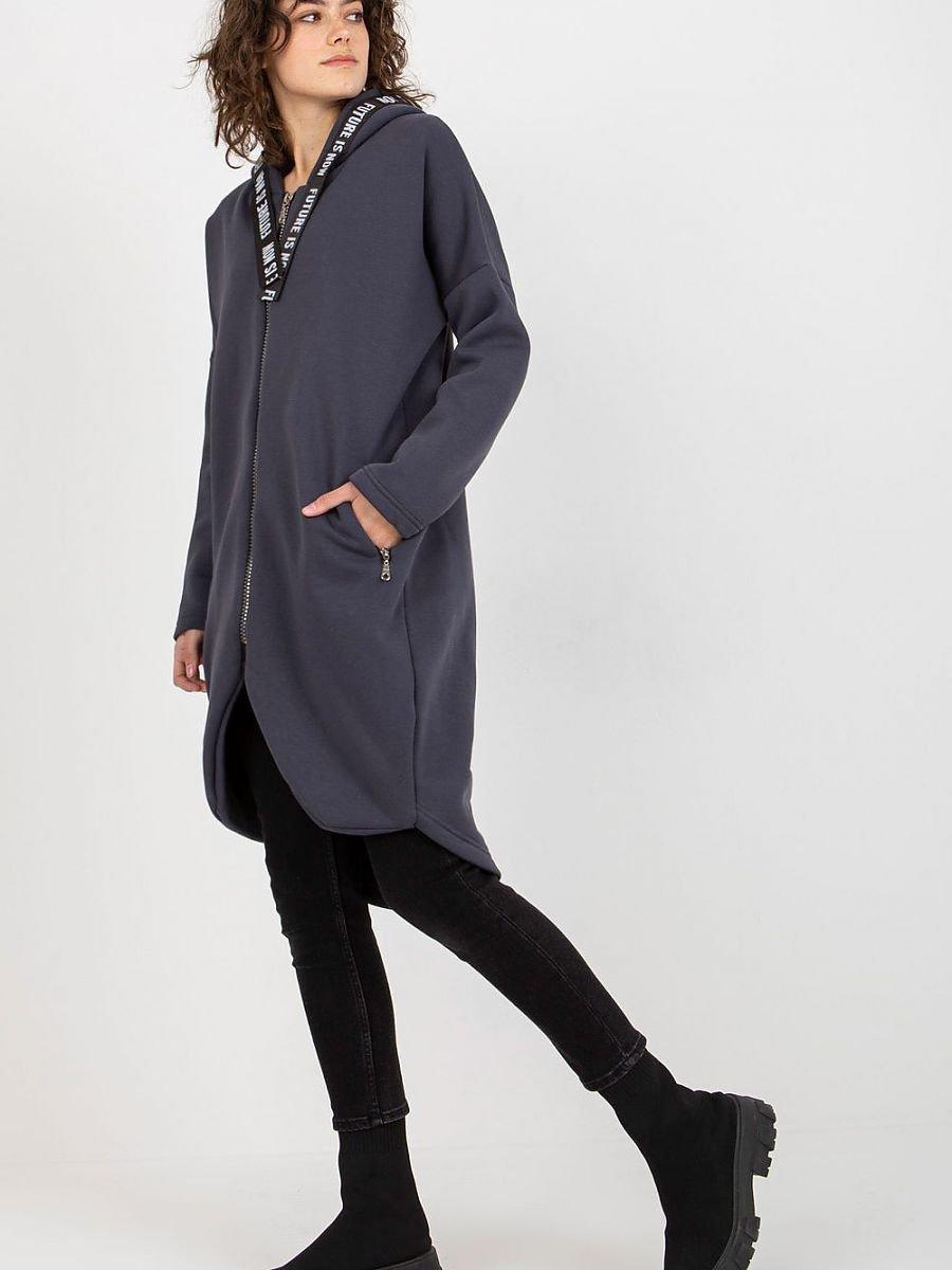 Women's sweatshirt with an extended cut, long sleeves and a hood. The sweatshirt is zippered, with slip pockets on the sides also zippered.