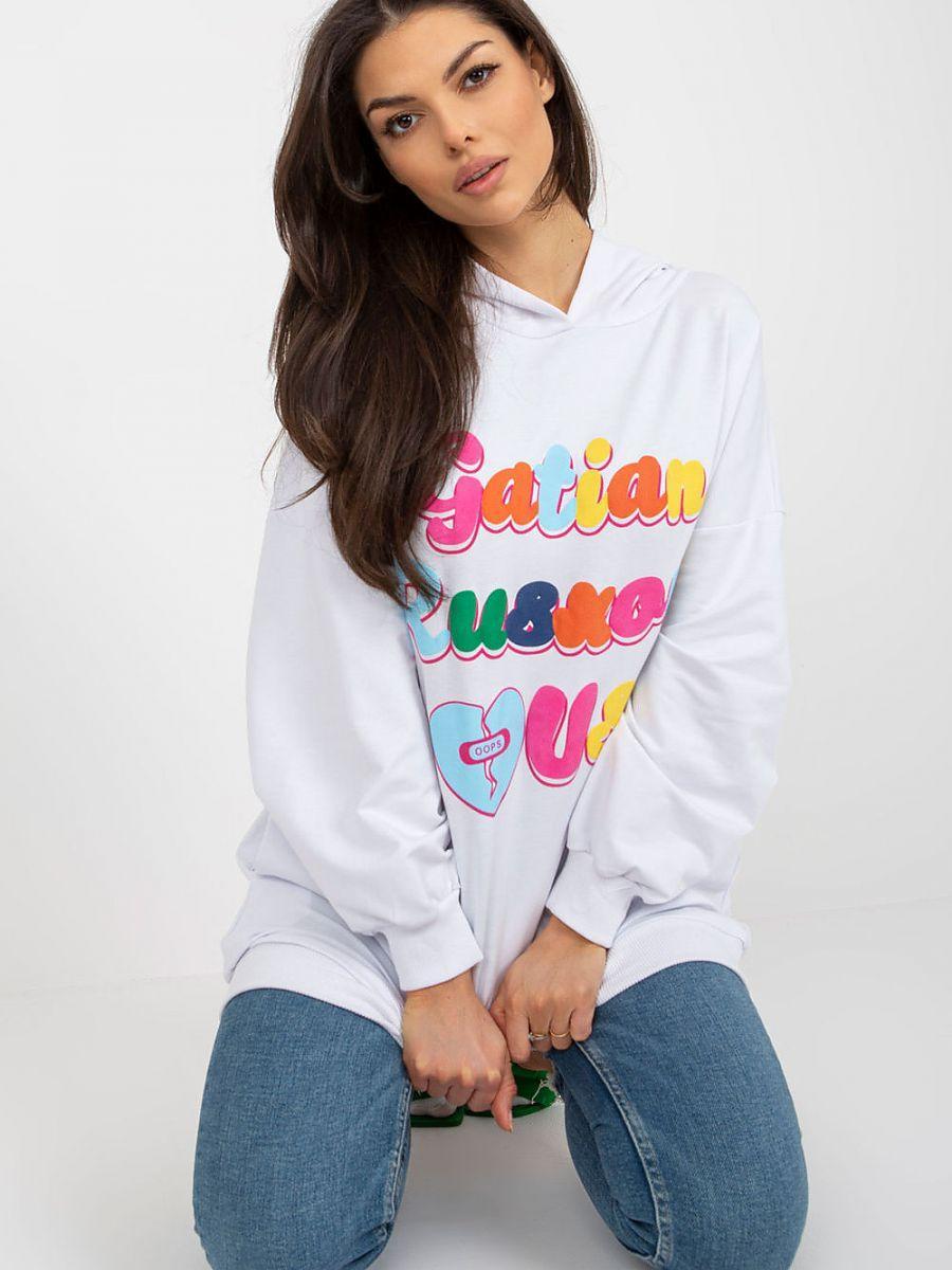 Women's sweatshirt with a simple cut, long sleeves and a hood. On the sides there are slip pockets. Decorative inscription on the front.
