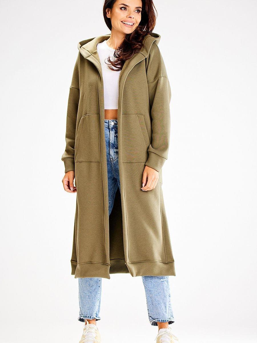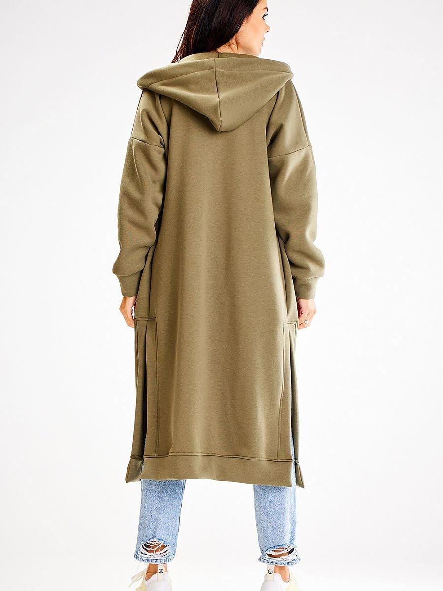 Long, loose-fitting unbuttoned sweatshirt with side slits, hood and pockets on the front of the front.