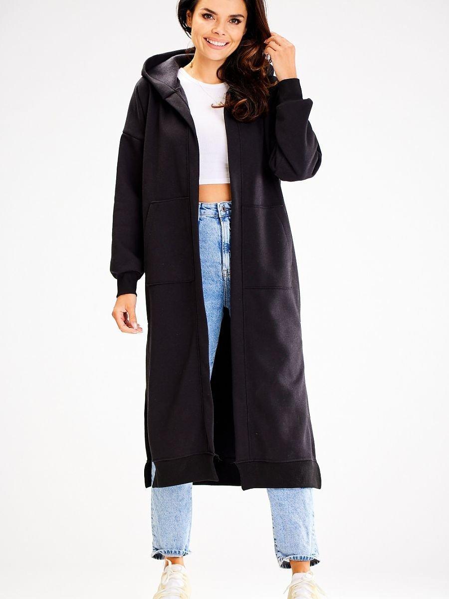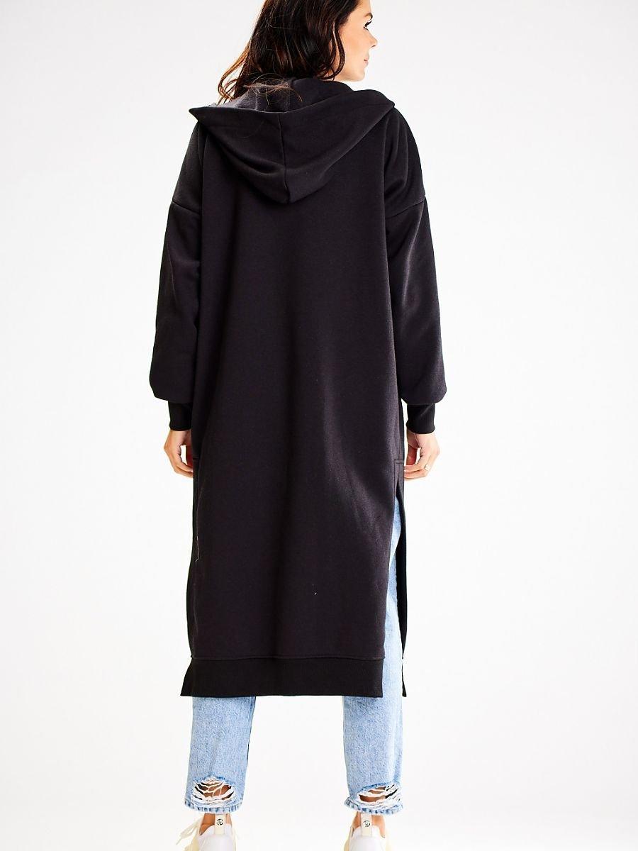 Long, loose-fitting unbuttoned sweatshirt with side slits, hood and pockets on the front of the front.