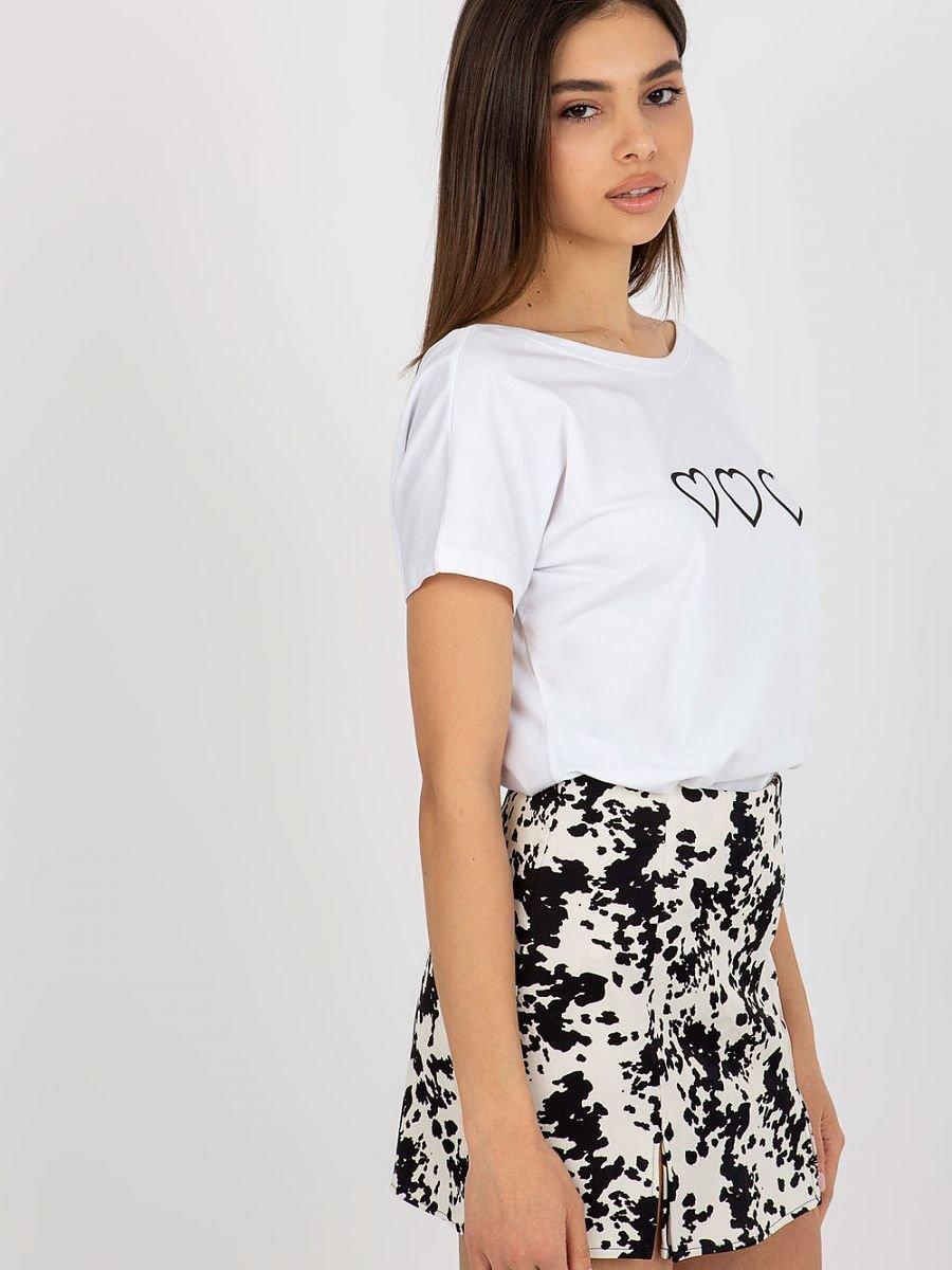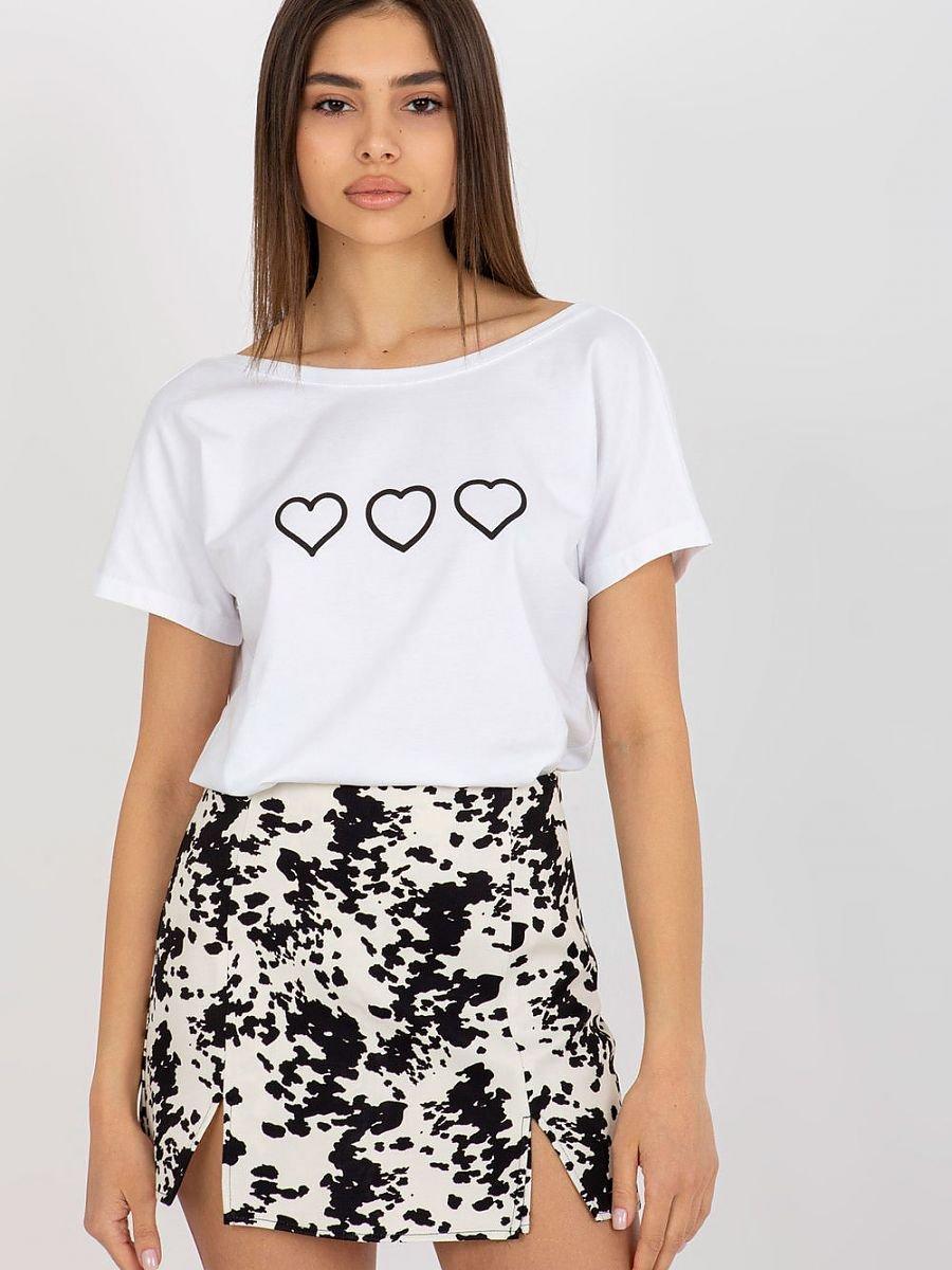 Women's straight cut t-shirt with a boat neckline and short sleeves. Decorative print on the front.