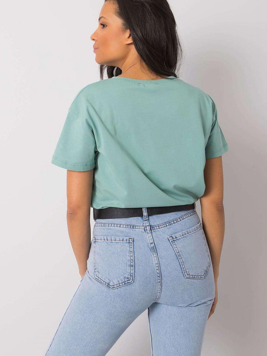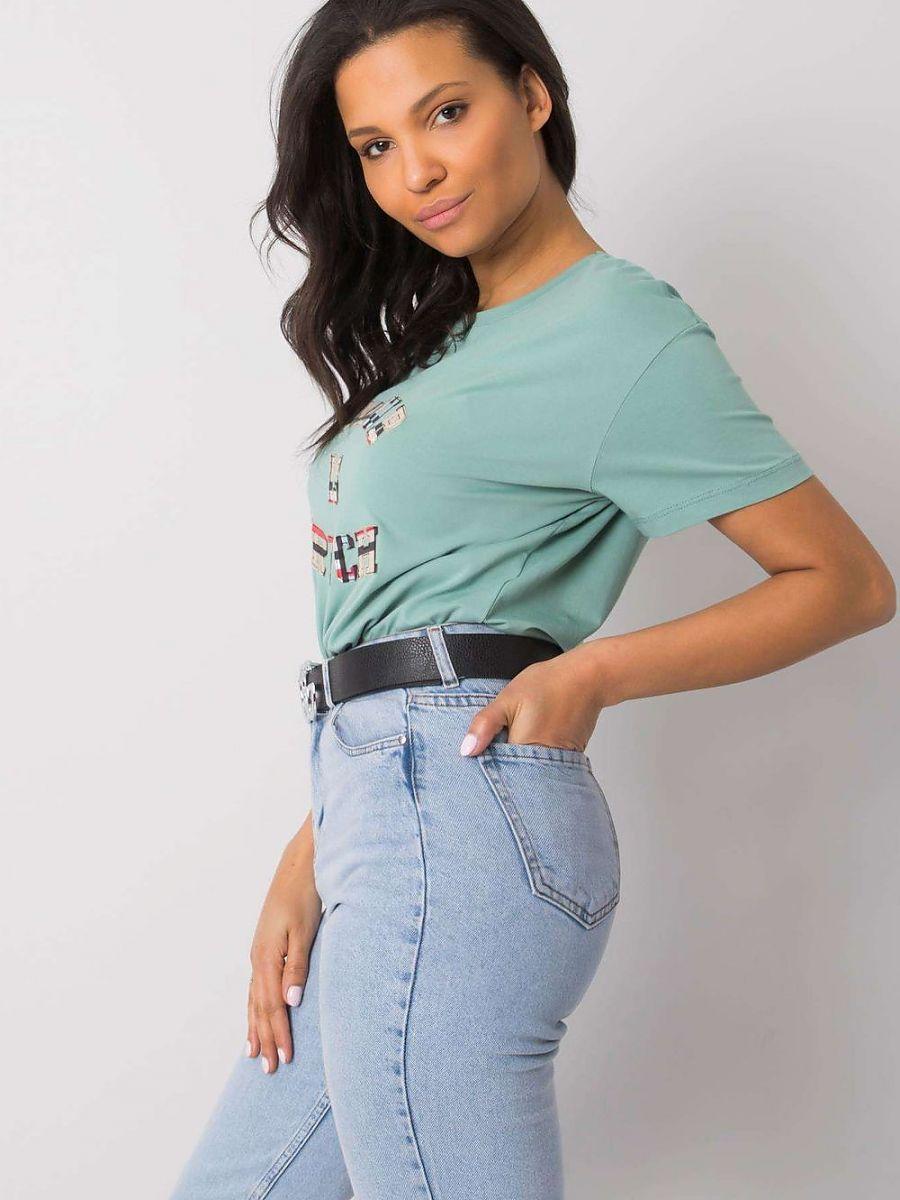 Women's t-shirt in a looser cut, with short sleeves and a round neckline. Decorative inscription on the front.