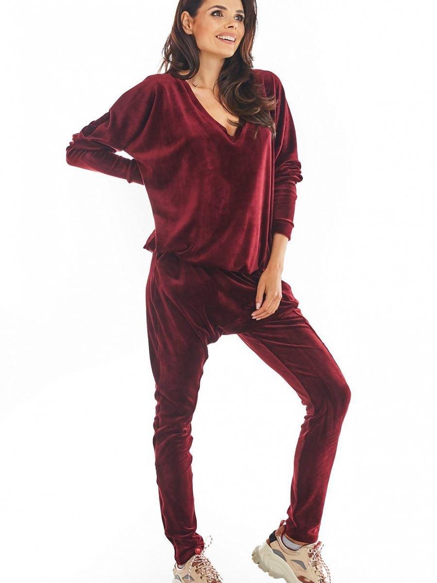Trousers with reduced crotch, straight legs, without a welt at the end. Made of very nice and warm velour. Available in 4 colours: beige, black, burgundy and pink.