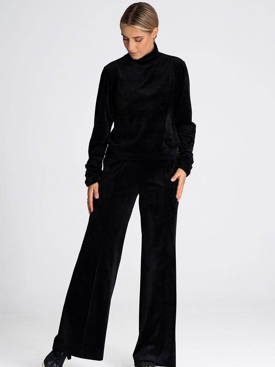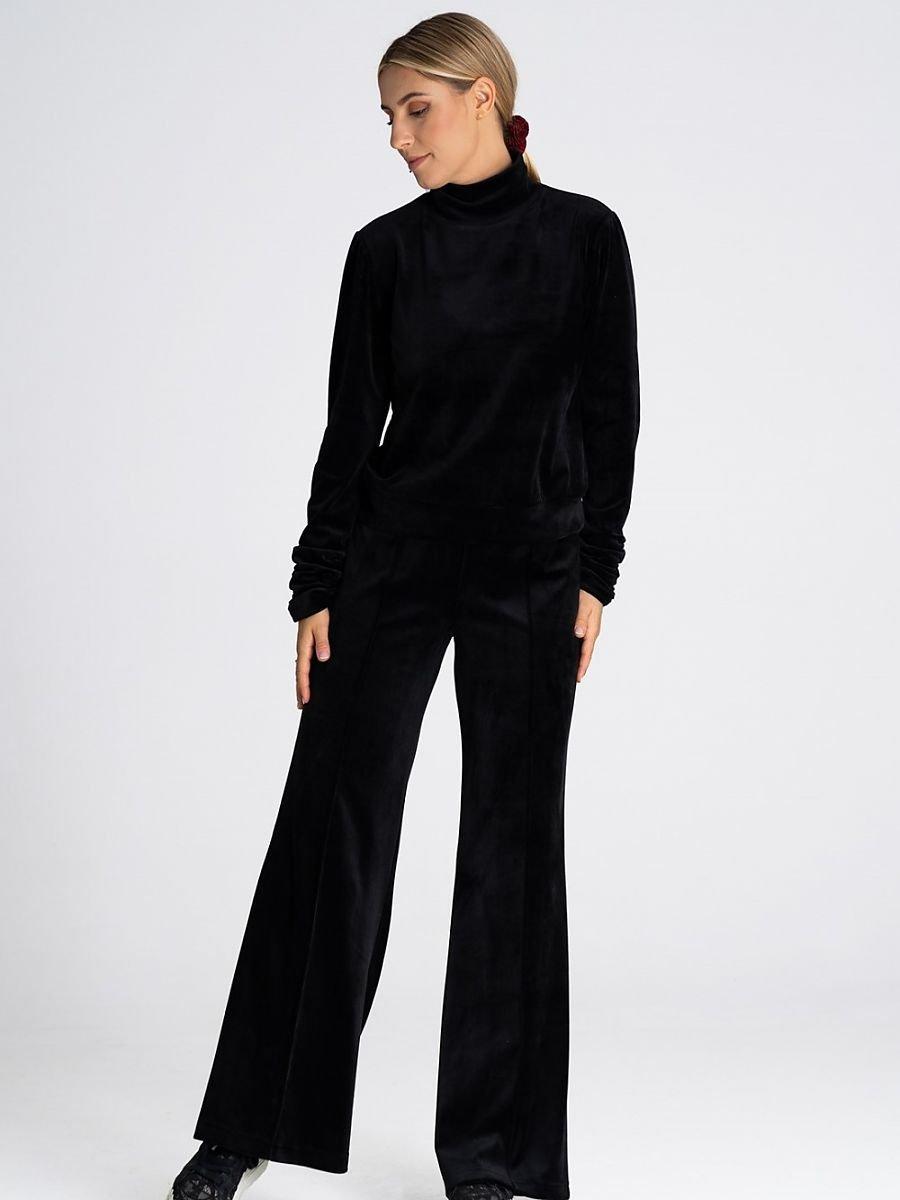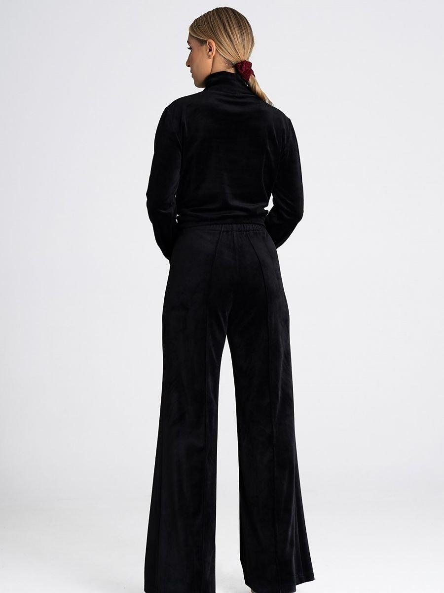 Women's bell-bottom pants. Made of velour with a high rise, which optically slims the waist.